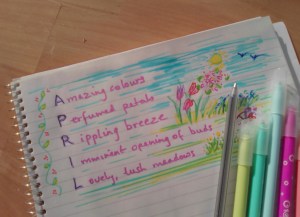 Acrostics are pleasing brain-ticklers, with the bonus that completion = poem! What’s more, the first letter of each line is given, so all you have to do is fill in the rest – however you see fit. In case you’ve gone blank about what exactly acrostics are, they’re poems in which the first letter of each line make a word going down the page, so it goes both ways, like this: