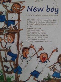 In my poem ‘New Boy’, the children feel for their new classmate as I believe most would, especially with one or two leading the way. Perhaps a poem like this can help too, with an illustration like this one by Tony Flowers, as published in The School Magazine, Australia.