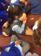 What’s more, leaf-writing offers a great excuse to get outside and moving. Help the children spin and launch their leaves. Encourage the children to sniff and describe their delicate, fruity fragrance, and ask them what their leaf feels like against their cheek.