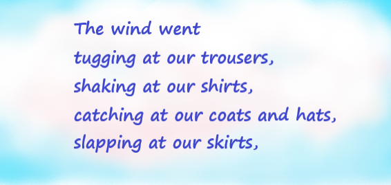 The wind makes a great theme for children to write about, whatever the weather outside but especially on a windy day. They love the personification potential – roar, howl, shriek, whimper etc. – and the fun you can have describing items caught up in it, like the kids’ clothes here.