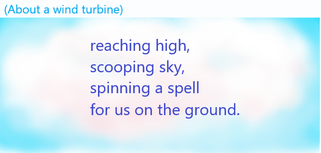 This poem celebrates alternative energy, or on a children’s level, celebrates the wonders of a modern windmill (or turbine) that whisks up the blue sky above us and mysteriously saves it and passes it on for use in people’s homes in a magically different form.