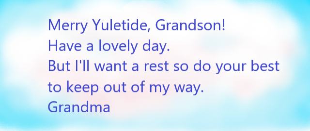 Hmm, not the warmest of greetings there! And this verse is just one of several of similar coolness from various members of the family – Mum, Dad, and sister, to this child recipient. Each has a little nag wrapped up in it, except for the child’s own message: ‘To myself – Have an absolutely wicked Christmas, me!’