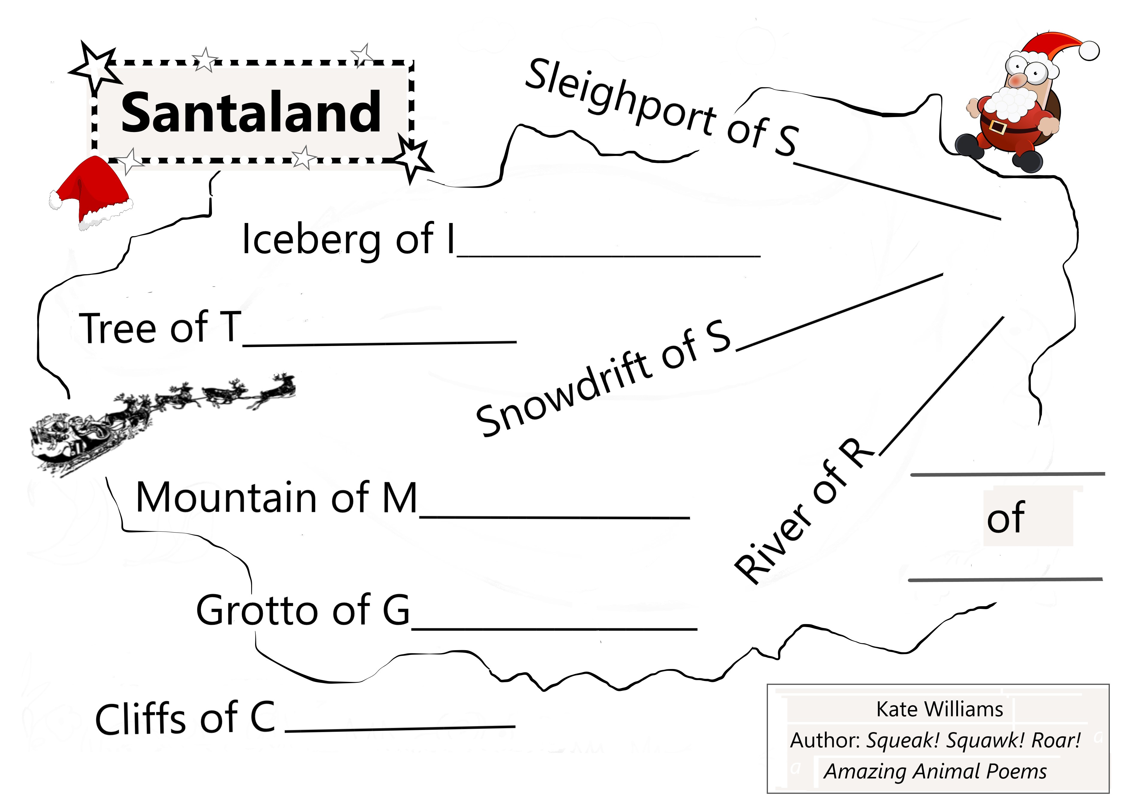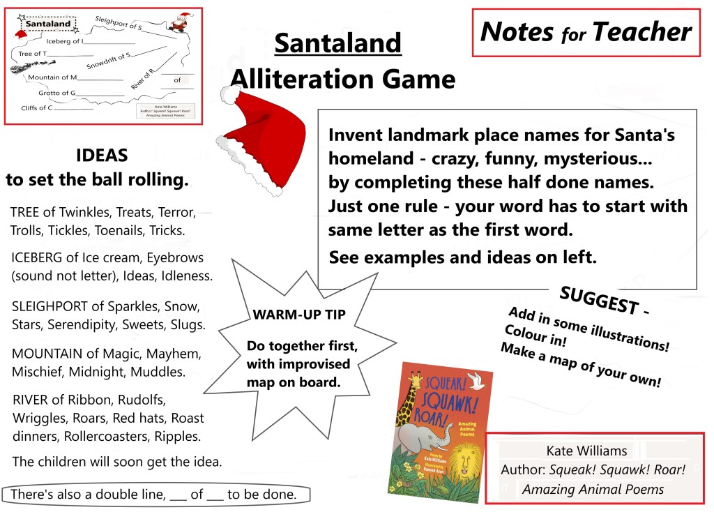 Just complete the landmark names on this map of Santa’s fantasy homeland, with any word you like, with ONE rule – it has to start with the same sound as the first word starts with, e.g. Mountain of Mischief. Yes – an alliteration game!