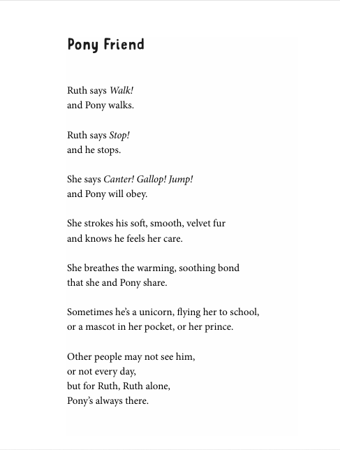 Sometimes a pet can be your secret friend, and sometimes your secret friend can be an (imaginary?) pet. Is Ruth’s pony real… or imaginary?