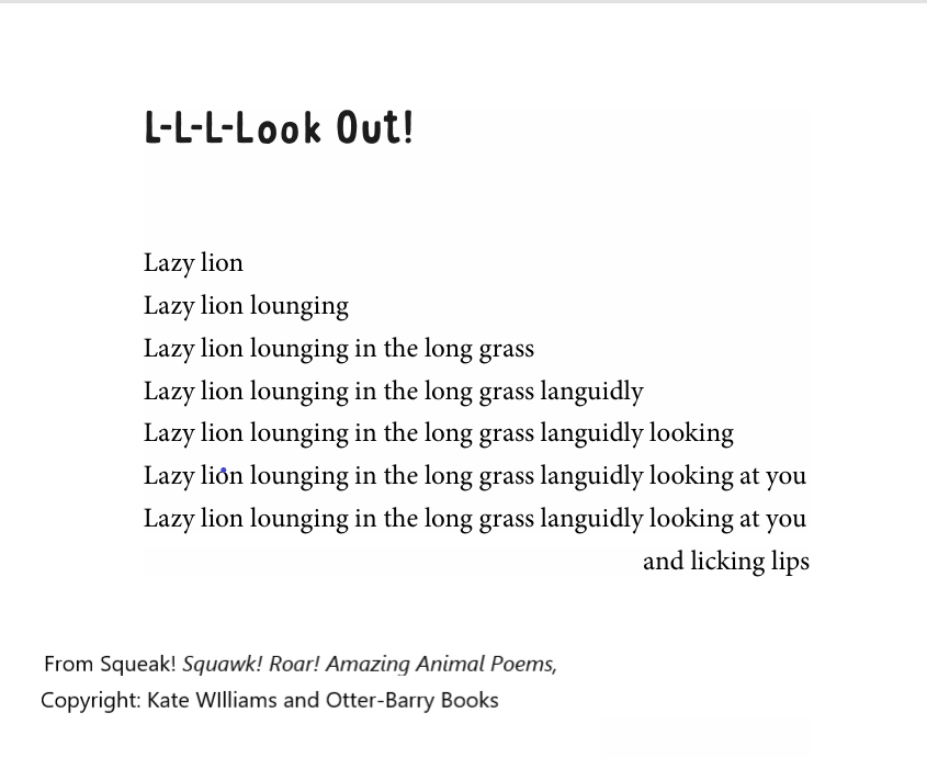 – Read out the poem and show them the printed version on the page (its shape loosely resembles a lying down lion!’