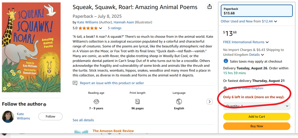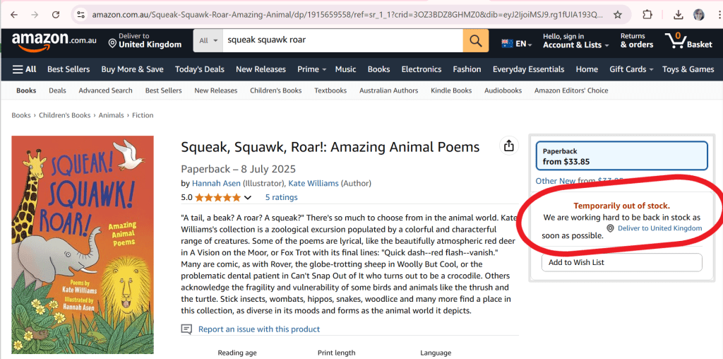 Squeak! Squawk! Roar! sold out on Amazon USA and Amazon Australia.